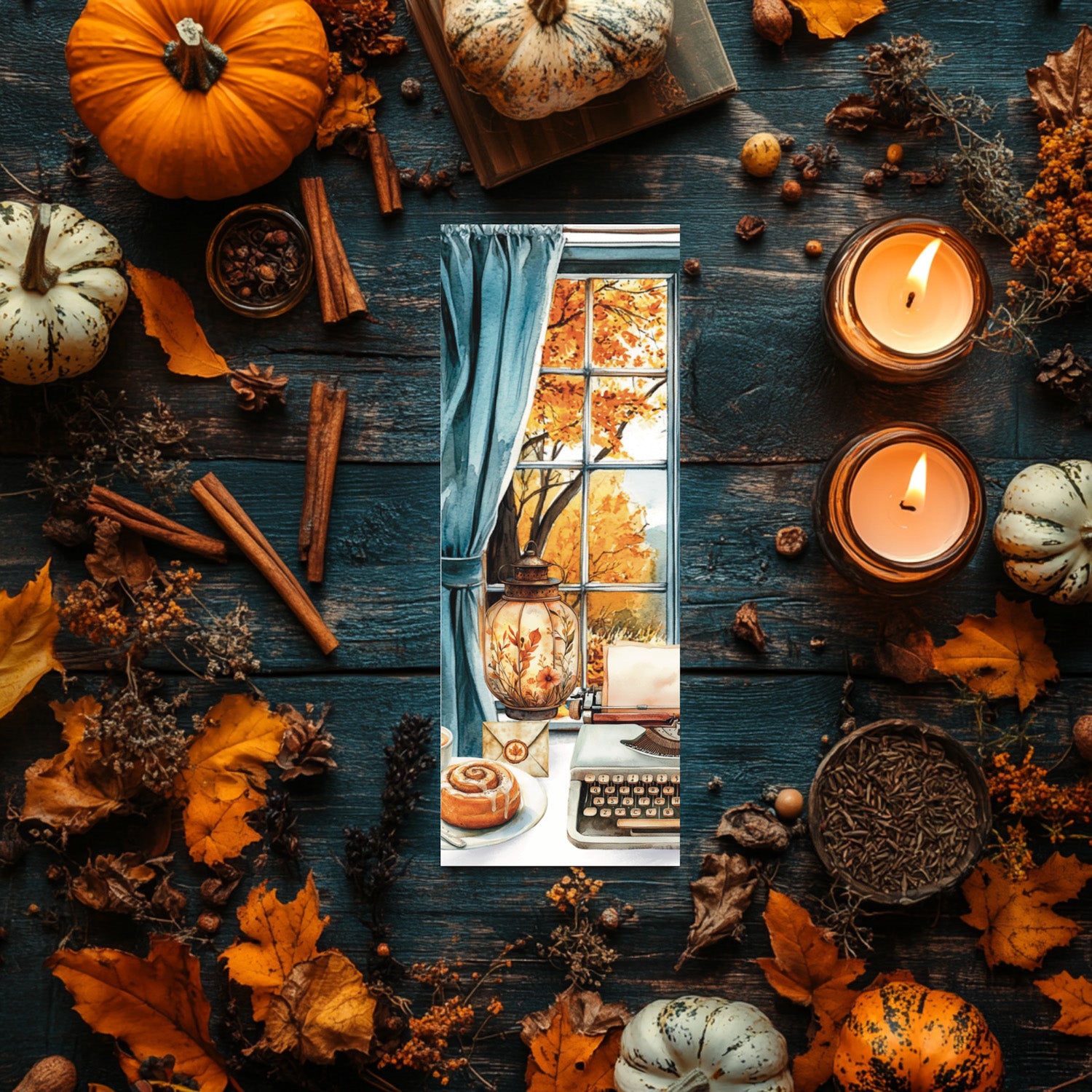 Marque-page Écrivain d’automne – Scène cosy à la fenêtre